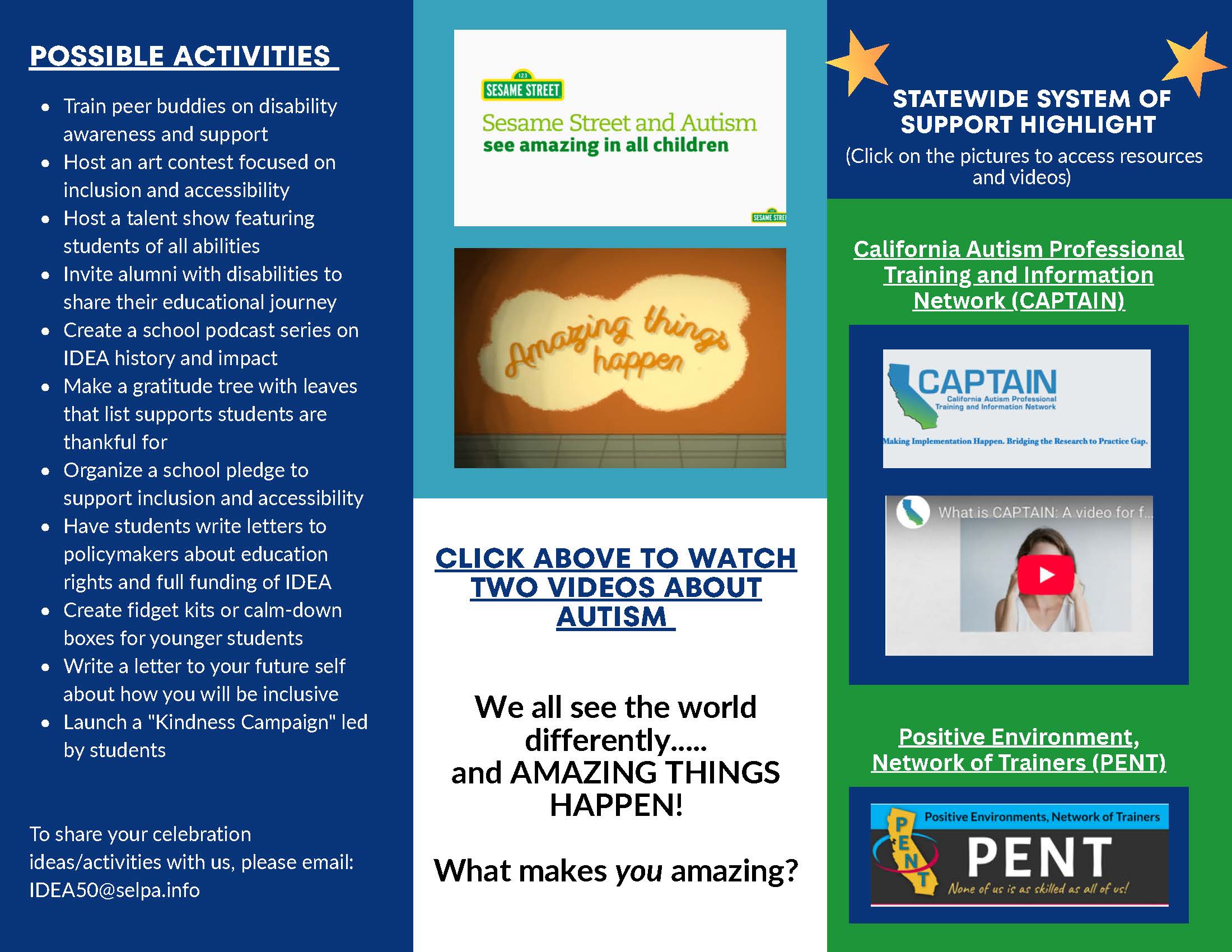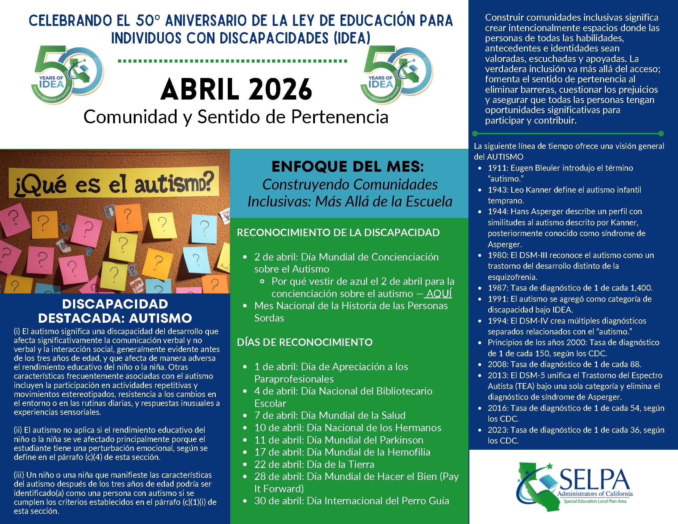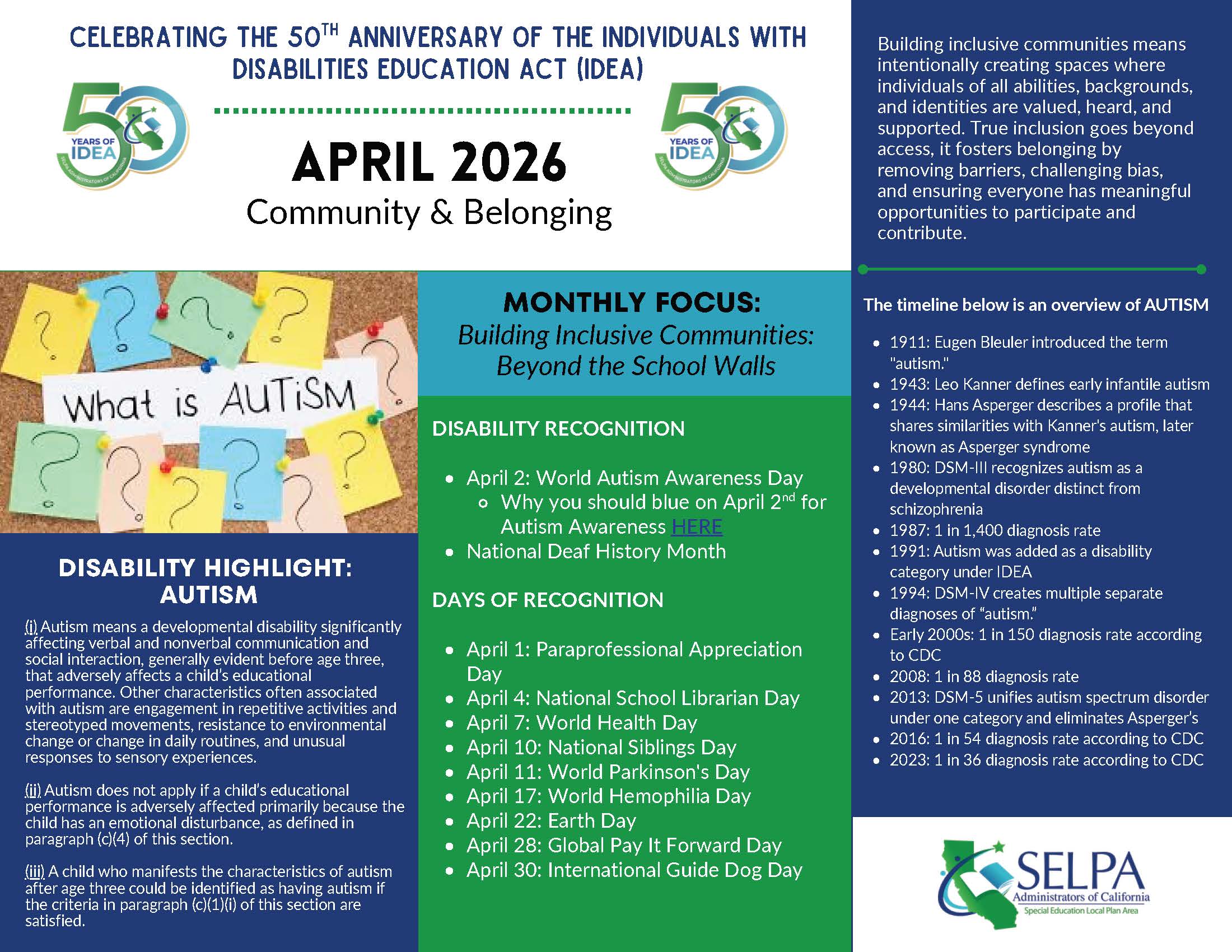 The SELPA Administrators of California are proud to launch a yearlong series of monthly resources to honor the 50th anniversary of the Individuals with Disabilities Education Act (IDEA). Since its passage in 1975, IDEA has transformed the educational landscape by ensuring that children with disabilities receive a Free Appropriate Public Education (FAPE) in the Least Restrictive Environment (LRE), grounded in the principles of equity, access, and inclusion.